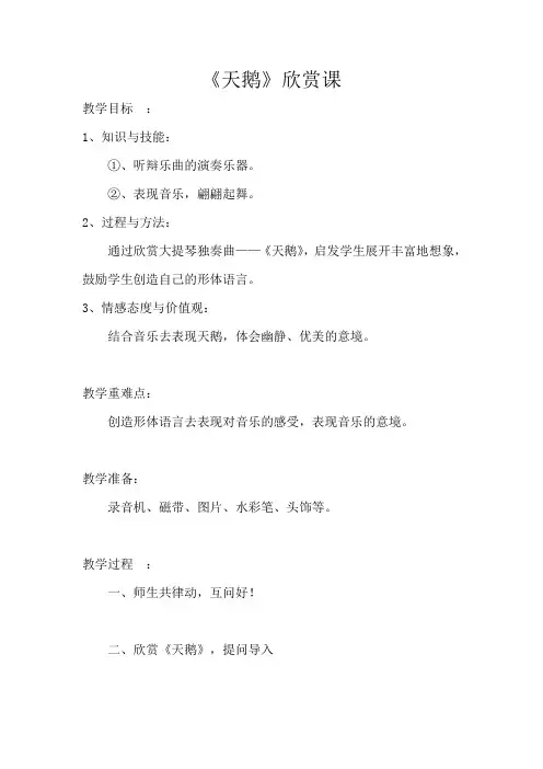 五、教学评价通过本次教学活动,学生能够欣赏到《天鹅》这首优美的作品,感受到音乐所表现的意境;同时,学生能够创造自己的形体语言,表现天鹅的形象,提高自己的审美能力和创造力。