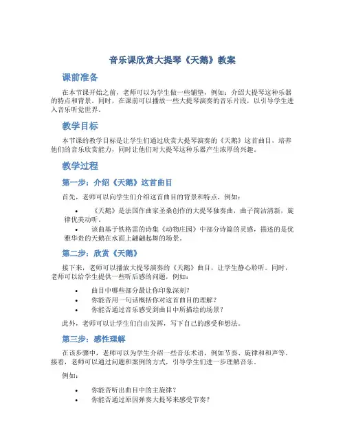 三、教学过程:1. 课前准备:教师提前准备好《天鹅》的音乐文件和大提琴的相关图片。