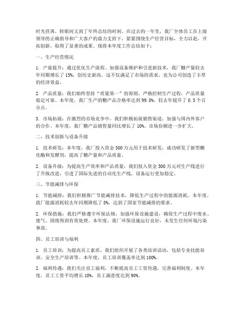 现将本年度工作总结如下:一、生产经营情况1. 产量提升:通过优化生产流程、加强设备维护和引进新技术,我厂糖产量较去年同期增长了15%,创历史新高。