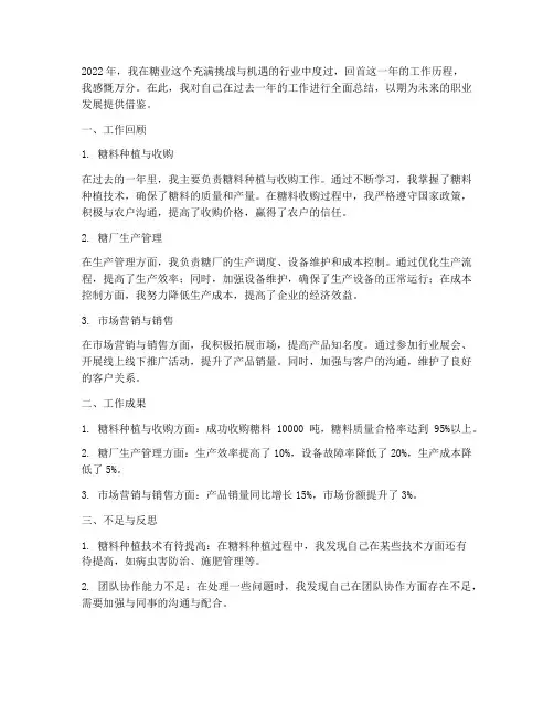 现将本年度工作总结如下:二、工作回顾1. 生产方面(1)熟练掌握糖厂生产流程,确保生产设备的正常运行。