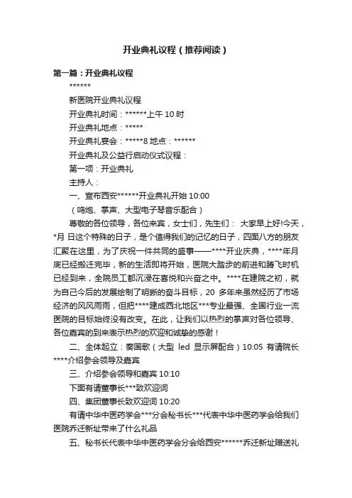 2. 新店开业仪式主持词尊敬的各位嘉宾,大家好!首先,我代表XYZ公司,衷心感谢各位嘉宾的光临,对于今天新店开业仪式的出席,我们感到非常荣幸和高兴。