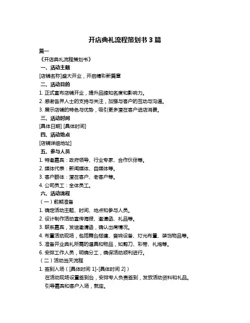 三、活动时间[具体时间]四、活动地点[店铺地址]五、参与人员1. 特邀嘉宾:[嘉宾名单]2. 媒体记者:[媒体名单]3. 广大顾客:[预计人数]六、活动流程1. 开场表演:[表演节目]2. 主持人开场:介绍活动背景、目的和流程3. 领导致辞:[领导名单]4. 剪彩仪式:邀请嘉宾进行剪彩,宣布店铺正式开业5. 产品展示:展示店铺的特色产品和服务6. 互动环节:设置互动游戏或抽奖环节,增加活动的趣味性和参与度7. 嘉宾参观:邀请嘉宾参观店铺,了解店铺的经营理念和文化七、活动宣传1. 线上宣传:利用社交媒体、网站、电子邮件等渠道进行宣传,吸引更多的顾客关注和参与2. 线下宣传:在店铺周边、商场、社区等地方张贴海报、发放传单,提高活动的知名度和影响力3. 媒体合作:邀请媒体记者参加活动,进行报道和宣传,扩大活动的传播范围八、活动预算1. 场地租赁费用:[X]元2. 表演费用:[X]元3. 嘉宾礼品费用:[X]元4. 宣传费用:[X]元5. 其他费用:[X]元总预算:[X]元九、活动效果评估1. 参与人数评估:通过门票销售、签到记录等方式,评估活动的参与人数是否达到预期目标2. 媒体曝光评估:通过媒体报道、社交媒体热度等方式,评估活动的媒体曝光度是否达到预期目标3. 顾客反馈评估:通过问卷调查、现场访谈等方式,评估顾客对活动的满意度和反馈意见,以便改进和完善后续活动十、注意事项1. 安全保障:活动现场设置安保人员,确保活动的安全和秩序2. 应急预案:制定应急预案,应对可能出现的突发情况3. 活动流程把控:严格按照活动流程进行,确保活动的顺利进行4. 嘉宾接待:安排专人负责嘉宾的接待和引导,确保嘉宾的体验和感受篇二《开业庆典流程策划书》一、活动主题[店铺名称]开业庆典二、活动目的通过举办开业庆典,向社会各界展示店铺的形象和特色,提高店铺的知名度和美誉度,吸引更多的顾客关注和光临。