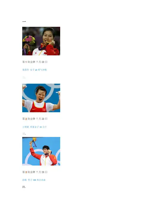中国伦敦奥运金牌榜1、北京时间2012年7月28日伦敦奥运会中国第一金——易思玲女子10米气步枪湖南省郴州市人2、北京时间2012年7月28日伦敦奥运会中国第二金——王明娟女子举重48公斤级湖南省永州市人3、北京时间7月29日凌晨3点15分中国第3枚金牌获得者——叶诗文女子400米混合泳浙江杭州人4、北京时间7月29日凌晨中国第4枚金牌获得者——孙杨400米自由泳决赛浙江杭州人5、北京时间7月29日中国第5枚金牌获得者——郭文珺女子10米气手枪决赛中国西安人6、北京时间7月29日伦敦奥运会中国第5枚金牌获得者女双三米板决吴敏霞何姿夺冠中国取第6金吴敏霞(上海)何姿(广西南宁)7、北京时间2012年7月30日晚上22:00 伦敦奥林匹克公园水上运动中心男双跳水10米台夺得中国第七金。