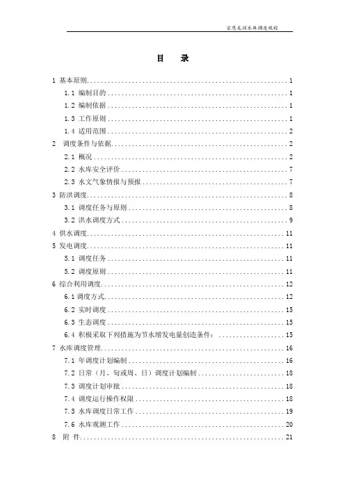 一、调度规程的原则1.以实际情况为基础,协调水资源的开发利用与水环境的要求;2.以充分考虑水库存量、水文需求、水资源开发与利用、水质要求及水库特点等因素为依据;3.符合所在区域水资源利用总体规划及经济、社会发展规律;4.协调水库调度与上游泄洪蓄洪要求以及有效防洪控制;5.综合考虑水库大规模应急事件对调度的必要影响;6.发挥水库抗旱、节水的作用;7.遵循有利于环境的措施,最大限度节约能源、保护水质、改善生态环境。