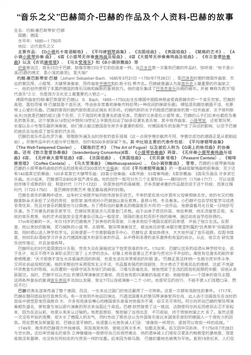 “⾳乐之⽗”巴赫简介-巴赫的作品及个⼈资料-巴赫的故事全名:约翰·塞巴斯蒂安·巴赫国籍:德国⽣卒年:1685—1 750年地位:近代⾳乐之⽗曲集》、《法国组曲》、《英国组曲》、《赋格的艺术》、《A钢琴曲集》、《法国组曲》、《英国组曲》、《赋格的艺术》、《⼩调托卡塔语赋格》、《平均律托卡塔语赋格》、《平均律钢琴主要作品:《D⼩调及组曲》,6⾸《⼤提琴⽆伴奏奏鸣曲及组曲》、《布兰登堡⾸《⼤提琴⽆伴奏奏鸣曲及组曲》、《布兰登堡协奏协奏奏鸣曲及组曲》,⼩调⼩调⼩提琴⾸《⼩提琴⽆伴奏奏鸣曲⼩提琴协奏协奏曲》,6⾸《⼩提琴⽆伴奏》和《B⼩调弥撒曲》等受难乐》和《》、《马太受难乐曲》以及《农民》以及《农民康塔塔康塔塔》、《马太舒曼曾说过,⾳乐归功于巴赫,就像宗教归功于它的创造者⼀样。