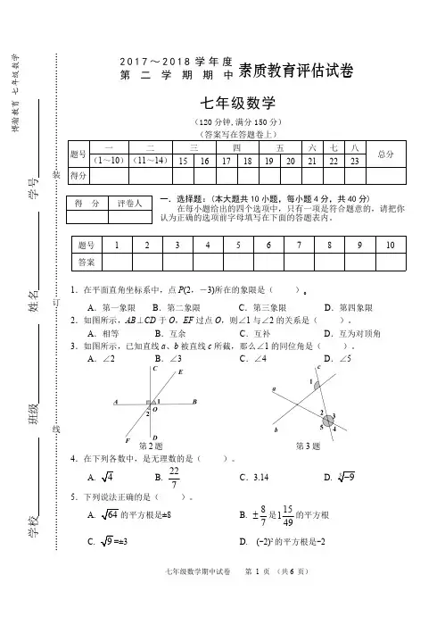 2016-2017学年度第二学期期中考试七年级数学试卷第Ⅰ卷(选择题,共30分)一、选择题(每题3分,共30分)1.9的算术平方根是A .3±B .9±C .3D .-32. 在平面直角坐标系中,点P (-3,5)所在的象限是A.第一象限B.第二象限C.第三象限D.第四象限3.在同一个平面内,两条直线的位置关系是A.平行或垂直B.相交或垂直C. 平行或相交D. 不能确定 4.如图所示,四幅汽车标志设计中,能通过平移得到的是奥迪 本田 大众 铃木A . B. C. D. 5.如图,梯子的各条横档互相平行,若∠1=80,则∠2的度数是A.80B.100C.120D.1506. 如图,点E 在AC 的延长线上,下列条件能判断AB ∥CD 的是A.∠3=∠4B.∠1=∠2C.∠D=∠DCED.∠D+∠ACD=180°7.已知直角坐标系中点P 到y 轴的距离为5,且点P 到x 轴的距离为3,则这样的点P 的个数是 A .1 B .2 C .3D .48.在实数23-,0.7 ,34,π,16中,无理数的个数是 A .1B .2C .3D .49.如图,将一块含有30°角的直角三角板的两个顶点叠放在矩形的两条对边上,如果∠1=27°,那么∠2的度数为A .53°B .55°C .57°D .60°第6题图 第5题图10.如图,直线l 1∥l 2,∠A=125°,∠B=85°,则∠1+∠2= A .30° B .35° C .36° D .40°第Ⅱ卷(非选择题 共90分)二、填空题:(每题3分,共18分)11.在直角坐标系中,写出一个在纵轴的负半轴上点的坐标 . 12.若一个数的平方根等于它本身,则这个数是13.若a 是介于3与7之间的整数,b 是2的小数部分,则ab-22的值为 14. 如图,将△ABC 沿BC 方向平移2cm 得到△DEF,若△ABC 的周长为16cm ,则四边形ABFD 的周长为 cm15.如果两个角的两边分别平行,其中一个角比另一个角的2倍少36°,那么这两个角 是16. 如图,将正整数按如图所示规律排列下去,若用有序数对(m ,n )表示m 排从左到右第n 个数。