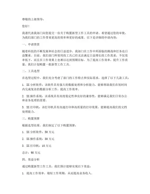 尊敬的领导:您好!我谨以此申请书,向公司领导申请购买以下工具,以确保我部门工作的高效、顺利进行。