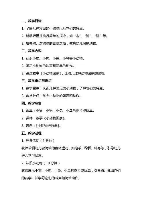 幼儿园小班《小动物回家》教案一、教学目标1. 了解几种常见的小动物以及它们的特点。