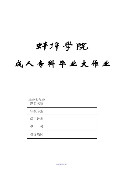 成人专科毕业大作业毕业大作业题目名称年级专业学生姓名学号指导教师二○××年××月××日目录(小三号黑体字,居中)(目录与目录内容之间空一行)内容摘要 (1)1 引言(或概述)(作为正文第一章,一级标题小四号加粗宋体字) (2)2 ××××××(正文第二章标题,一级标题小四号加粗宋体字)………………P 2.1 ××××××(正文第二章第一节标题,二级标题小四号宋体字)…………P 2.1.1××××××(三级标题小四号宋体字)………………………………………P 2.1.2××××××(三级标题小四号宋体字)………………………………………P 2.2 ××××××(正文第二章第二节标题,二级标题小四号宋体字)…………P 2.2.1××××××(三级标题小四号宋体字)………………………………………P 2.2.2××××××(三级标题小四号宋体字)………………………………………P 2.2.3××××××(三级标题小四号宋体字)………………………………………P2.3××××××(正文第二章第三节标题,二级标题小四号宋体字)…………P3 ××××××(正文第三章)……………………………………………………P 3.1(正文第三章第一节标题,二级标题小四号宋体字)……………………………P 3.2(正文第三章第一节标题,二级标题小四号宋体字)……………………………PX××××××(正文第X章)………………………………………………………P ………………………………………………………………………………注:①目录按三级标题编写(必须与正文标题一致),要求层次清晰。