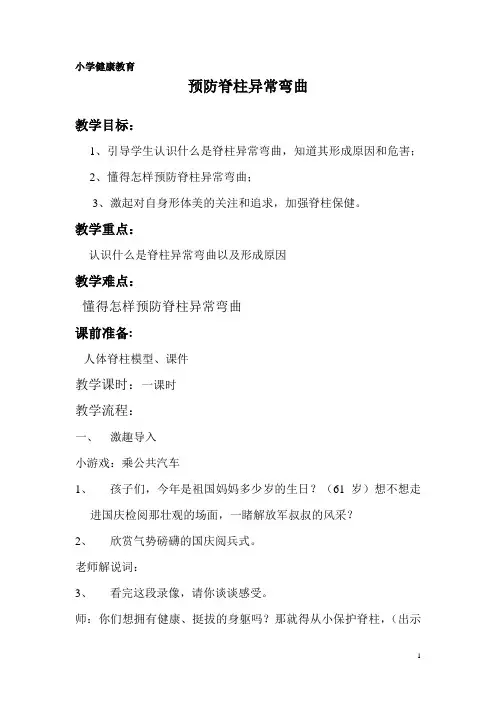 小学健康教育教案预防脊柱异常弯曲[教学目的]让学生知道脊柱异常弯曲的原因,掌握脊柱异常弯曲的预防措施。