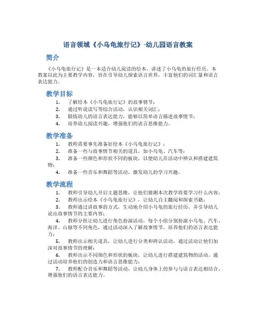 语言领域《小乌龟旅行记》-幼儿园语言教案简介《小乌龟旅行记》是一本适合幼儿阅读的绘本,讲述了小乌龟的旅行经历。