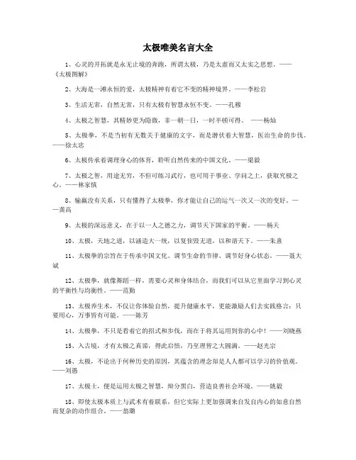 ——翁璐19、实践太极,不但教会我们自然、坚持的智慧,更让我们学会如何在他人思考中仰望和学习!——张丹20、太极拳修习者应该追求和谐,也就是克服拙劣不协调,到达“和”的境界,有时也需要经历一些心酸痛苦。