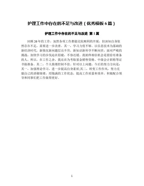 护理工作中存在的不足与改进(优秀模板6篇)护理工作中存在的不足与改进第1篇回顾20年的工作,虽然各项工作都能比较顺利的开展,但深知自身依然存在不足,需要进一步改善。