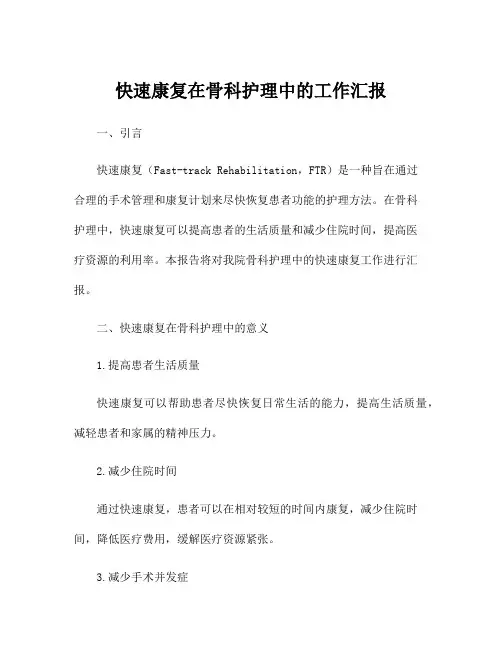快速康复在骨科护理中的工作汇报一、引言快速康复(Fast-track Rehabilitation,FTR)是一种旨在通过合理的手术管理和康复计划来尽快恢复患者功能的护理方法。