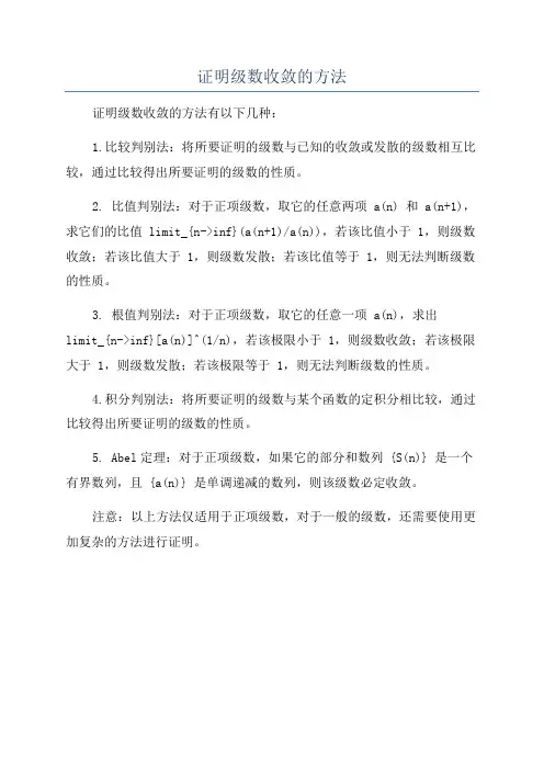 4.积分判别法:将所要证明的级数与某个函数的定积分相比较,通过比较得出所要证明的级数的性质。