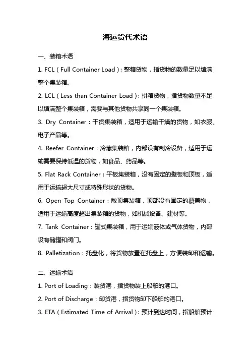 海运货代术语一、装箱术语1. FCL(Full Container Load):整箱货物,指货物的数量足以填满整个集装箱。
