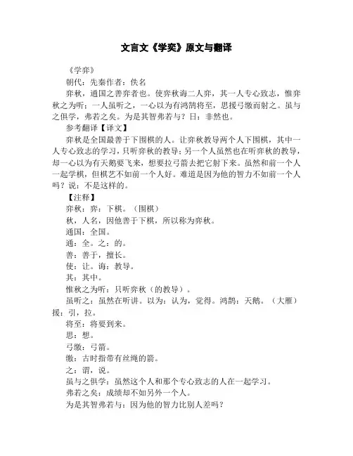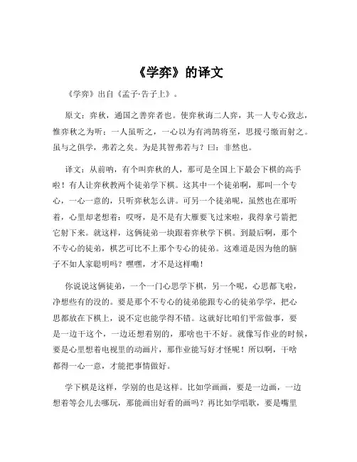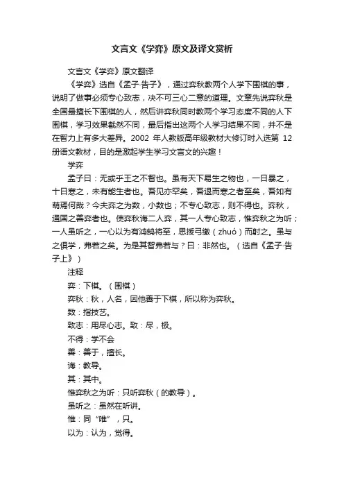 文言文《学弈》原文及译文赏析文言文《学弈》原文翻译《学弈》选自《孟子·告子》,通过弈秋教两个人学下围棋的事,说明了做事必须专心致志,决不可三心二意的道理。