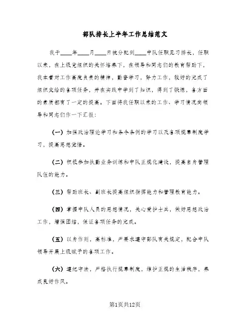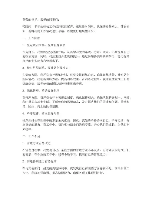 让我们携手并进,共同努力,为实现中国梦强军梦而奋斗!愿我们的部队更加团结、更加强大!第2篇示例:半年来,我在领导的指导下,认真履行了排长的职责,努力维护军队的正常秩序和纪律。