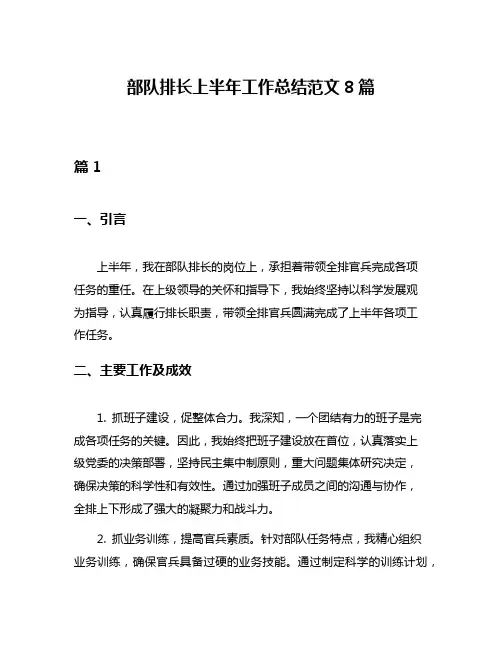 部队排长2024年上半年工作总结5篇篇1一、背景2024年上半年,我作为部队排长,认真履行职责,带领全排官兵积极参与各项任务。