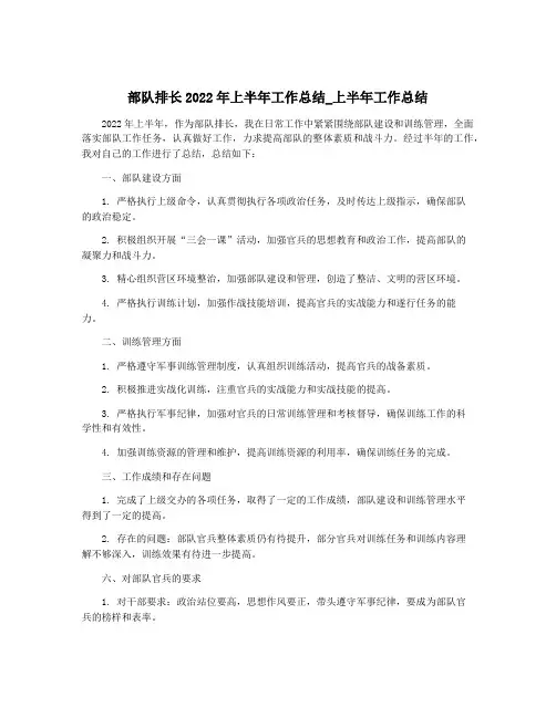 现将半年来的工作总结如下:二、主要工作及成效1. 军事训练半年来,我排始终把军事训练摆在首位,严格按照年度训练计划开展训练。