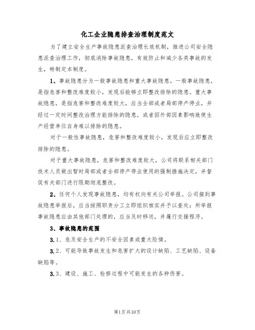 化工企业隐患排查治理制度范文为了建立安全生产事故隐患派查治理长效机制,推进公司安全隐患派查治理工作,彻底消除事故隐患,有效防止和减少各类事故的发生,特制定本制度。