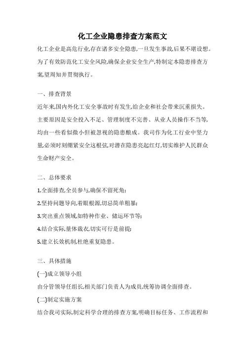 化工企业安全隐患排查工作方案份一、总体目标本方案的总体目标是全面排查化工企业的安全隐患,解决工作过程中的安全问题,建立健全安全管理体系,确保安全生产。