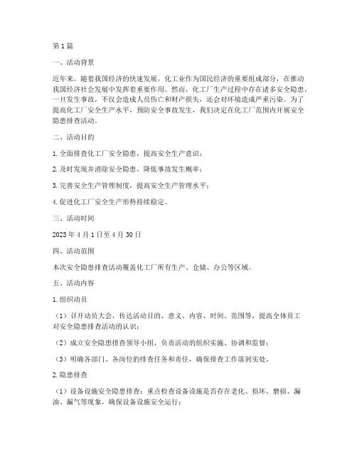 二、排查目标本次排查的目标是针对化工企业生产工艺中存在的安全隐患进行全面排查,确定可能出现的事故风险,并提出相应的改进建议。