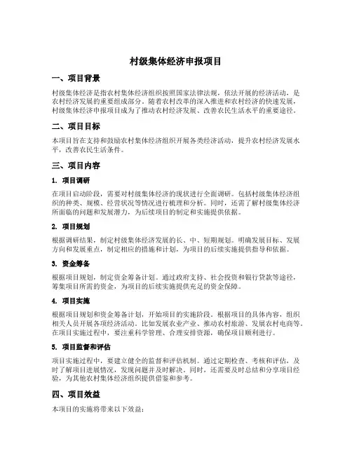 村级集体经济申报项目一、项目背景村级集体经济是指农村集体经济组织按照国家法律法规,依法开展的经济活动,是农村经济发展的重要组成部分。