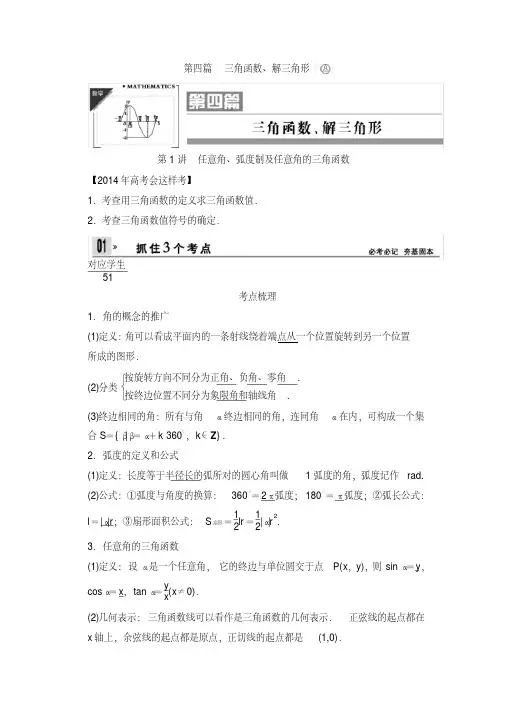 第三章 三角函数、解三角形第一节 任意角、弧度制及任意角的三角函数2019考纲考题考情1.角的有关概念(1)从运动的角度看,角可分为正角、负角和零角。