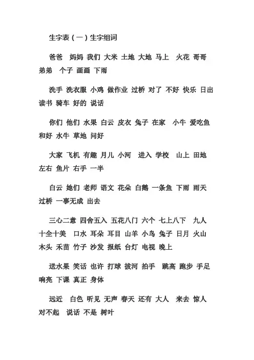 生字表(一)生字组词爸爸妈妈我们大米土地大地马上火花哥哥弟弟个子画画下雨洗手洗衣服小鸡做作业过桥对了不好快乐日出读书骑车好的说话你们他们水果白云皮衣兔子在家小牛爱吃鱼和好水牛草地问好大家飞机有趣月儿小河进入学校山上田地左右鱼片右手一半白云她们老师语文花朵白鹅一条鱼下雨雨天过桥一事无成出去三心二意四舍五入五花八门六个七上八下九人十全十美口水耳朵耳目山羊小鸟兔子日月火山木头禾苗竹子沙发报纸台灯电视晚上送水果笑话也许打球拔河拍手跳高跑步手足响亮下课真正身体远近白色听见无声春天还有大人来去惊人对不起说话不是树叶圆月夏天秋风雪白肚子就是冬天竹排中间游动流水唱歌两天河岸树苗绿水青山江南哪里一座山房子漂亮青草球门窗花香水房屋不要他们爷爷一棵树见到给你穿上暖气冷暖开门雨伞火热安静夜晚小床光明举手头上看望低头故乡开船弯弯的坐下只有看见闪电星星蓝天阳光画像金色田野更高前面长长的早晨拉手进步你是谁影子前进后面平常跟着黑狗它们朋友比尾巴长短一把伞猴子松鼠米老鼠扁平最少公鸡公开鸭子黄山黄牛花猫杏子桃树苹果红红火火身边多少人群颗粒土堆商场广场书包牛奶牙齿毛巾毛笔尺子作业本东西菜园豆角萝卜细心又高又大捉老鼠迷人捉迷藏嘴巴越长越高风雨明白鲜花尘土笔尖灭火力气力不从心男人休息手心森林从前听众心想告诉诉说走路能力走路北京城市京城天安门安心广告升旗上升国旗雨点点头数不清彩球飘落落叶天空学问问路回答回去一问一答地方方向和平搭桥房间这些一些都是住手你呢好啊没有很多自我自己飞吧您好带鱼带头是吗深夜学校小学开会会见那儿风景景色美好美术人次一次西瓜瓜果燕子什么多么那么一样样子说得对跑得快再见再会可是可口可爱仔细细小高兴发现现在找朋友找人花生生长旁边种树也许许多格外里外鲜艳艳阳天写呀每天自言自语方言语文下雪啦梅子梅花用力几步成语成就青蛙为什么参加加法山洞睡觉放学分布布熊飞快怎么怎样吃饭米饭班长拿走正是礼物生物今天孩子让路让座一起对不起游玩往后来往发烧知道化石化学砍树造船满足满面春风舍不得结巴结果过年心直口快动作结束美丽生字表(二)生字组词第一单元:一个二十三个十月木头禾苗上下土地个人八月一日出入大山天上大小天天个子入口个人一家三口一分为二木马一草一木一上一下七上八下第二单元:人口大火中文六个七人儿子九十无人无力日子日出大门月牙月儿不开五四开门门口五花八门五光十色日月十月一日第三单元:入耳木耳耳目头上大米不见白米白云白天水田水电山水也是长大山上出入飞鸟马上公车车上鸟儿马车电车公开白马日出出门开车第四单元:牛羊大小多少毛巾大牙月牙尺子萝卜又大又圆心中大风水力力气手心开心小心中心水田风车电力又来了出力公牛山羊小手水手公园风光水牛开水第五单元:广大上升手足走人走开走一走大方半天一半下巴工业本子平方书本书目自己东西作业东风一回回来回去下巴汽车一片云东方书皮一本书西天水平皮毛牛皮一大片羊皮回头出走走出平安第六单元:生日出生公里心里里面水果果子果皮果木几个用力小鱼今天正好方方正正风雨两人瓜果木瓜西瓜瓜子大衣毛衣风衣上衣外衣来去一年年月左右雨衣两个今年正(zhēng)月鱼片一年又一年-温馨提示:如不慎侵犯了您的权益,可联系文库删除处理,感谢您的关注!。