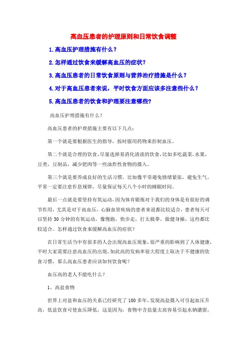 高血压患者的护理原则和日常饮食调整1.高血压护理措施有什么?2.怎样通过饮食来缓解高血压的症状?3.高血压患者的日常饮食原则与营养治疗措施是什么?4.对于高血压患者来说,平时饮食方面应该多注意些什么?5.高血压患者的饮食和护理要注意哪些?高血压护理措施有什么?高血压患者的护理措施主要有以下几点:第一个就是要根据医生的指导,按时服用药物来控制血压。