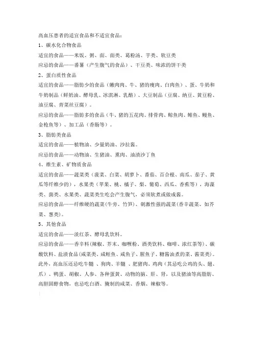 高血压患者的适宜食品和不适宜食品:1、碳水化合物食品适宜的食品——米饭、粥、面、面类、葛粉汤、芋类、软豆类应忌的食品——番薯(产生腹气的食品)、干豆类、味浓的饼干类2、蛋白质性食品适宜的食品——脂肪少的食品(嫩肉肉、牛、猪的瘦肉、白肉鱼)、蛋、牛奶和牛奶制品(鲜奶油、酵母乳、冰淇淋、乳酪)、大豆制品(豆腐、纳豆、黄豆粉、油豆腐、青菜丝豆腐)。