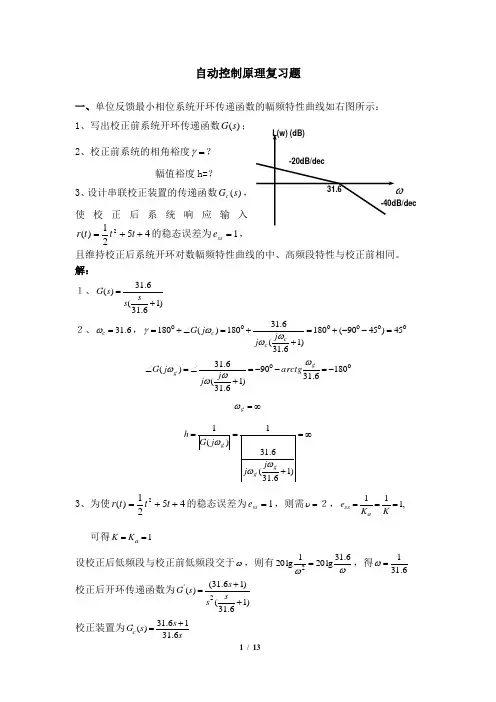 自动控制原理复习题一、单位反馈最小相位系统开环传递函数的幅频特性曲线如右图所示: 1、写出校正前系统开环传递函数()G s ; 2、校正前系统的相角裕度γ=?幅值裕度h=?3、设计串联校正装置的传递函数)(s G c ,使校正后系统响应输入4521)(2++=t t t r 的稳态误差为1=ss e ,且维持校正后系统开环对数幅频特性曲线的中、高频段特性与校正前相同。
