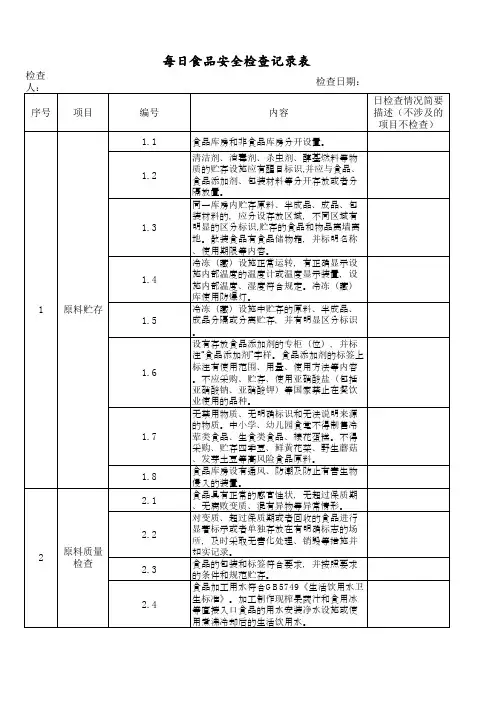 (收货厨师也需要进行监督)相关表格:日常收货记录Daily Receiving Record (收货员进行记录)CCP2:储存食品储存因严格根据食品包装袋上给出提示进行储存,冷冻,冷藏或是常温保存。