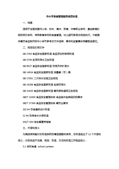二、规范性引用文件GB 2760 食品安全国家标准食品添加剂使用标准GB 5749 生活饮用水卫生标准GB 8537 食品安全国家标准饮用天然矿泉水GB 14934 食品安全国家标准消毒餐(饮)具GB 17051 二次供水设施卫生规范GB 19298 食品安全国家标准包装饮用水GB 31654 食品安全国家标准餐饮服务通用卫生规范GB/T 22000 食品安全管理体系食品链中各类组织的要求GB/T 27306 食品安全管理体系餐饮业要求JGJ 64 饮食建筑设计标准CJ 94 饮用净水水质标准WS/T 554 学生餐营养指南三、术语和定义为确保使用者对本标准条款的精准理解和使用,本标准给出了12个术语和定义;分别来自于法律、规定、标准、办法和标准工作组自定义:3.1 学校食堂 school canteen指学校为学生和教职工提供就餐服务,具有相对独立的原料存放、食品加工制作、食品供应及就餐空间的特定餐饮服务提供者。