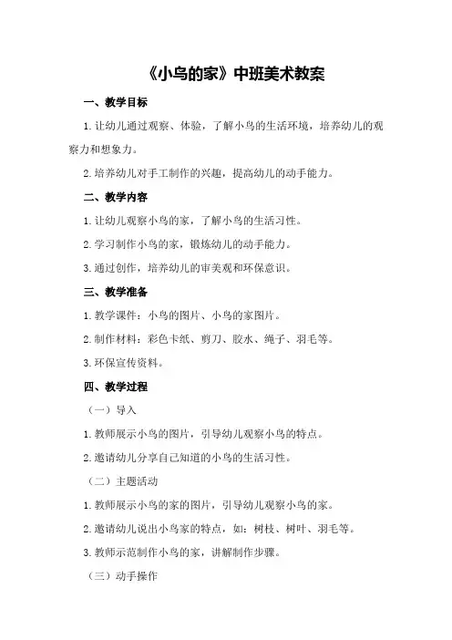 《小鸟的家》中班美术教案一、教学目标1.让幼儿通过观察、体验,了解小鸟的生活环境,培养幼儿的观察力和想象力。
