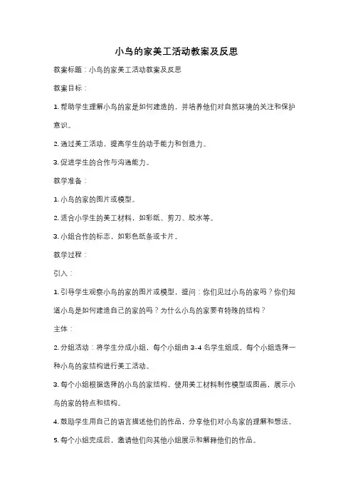 小鸟的家美工活动教案及反思教案标题:小鸟的家美工活动教案及反思教案目标:1. 帮助学生理解小鸟的家是如何建造的,并培养他们对自然环境的关注和保护意识。