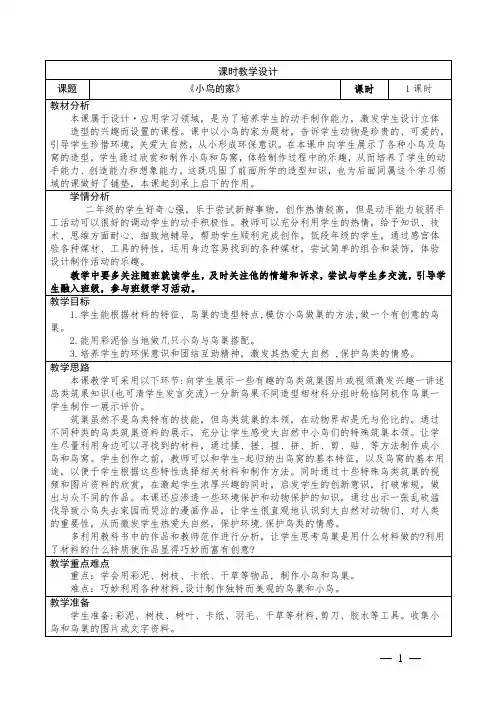 教学过程:引入:1. 引导学生观察小鸟的家的图片或模型,提问:你们见过小鸟的家吗?你们知道小鸟是如何建造自己的家的吗?为什么小鸟的家要有特殊的结构?主体:2. 分组活动:将学生分成小组,每个小组由3-4名学生组成。