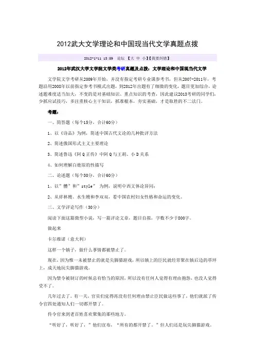 2012武大文学理论和中国现当代文学真题点拨2012-1-11 13:59 论坛【大中小】【我要纠错】2012年武汉大学文学院文学类考研真题及点拨:文学理论和中国现当代文学文学院文学考研从2009年开始,并没有指定考研专业课参考书,但从2007-2011年,考题沿用2008年以前指定参考书模式出题,到2012年出题有了细微的变化,题目更加综合,论述题难度适当加大,不变的是对基础知识、重点知识的考查,因此建议2013考研的同学们,少抓应试技巧,多注重核心主干知识,抓准根本,夯实基础,才是取胜的不二法门。