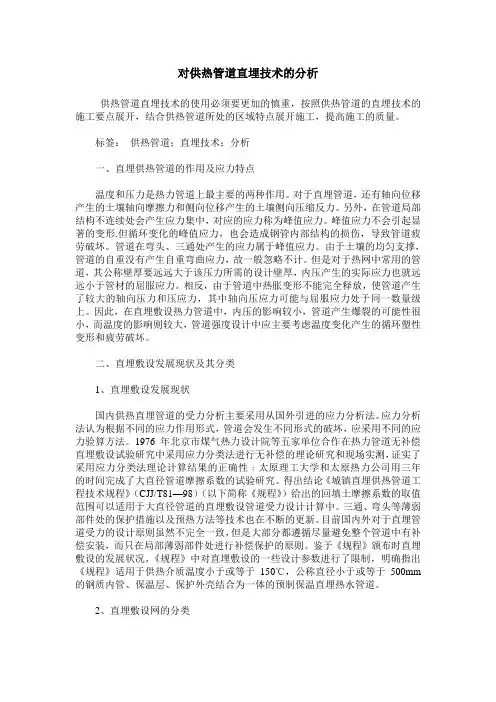 二、直埋敷设发展现状及其分类1、直埋敷设发展现状国内供热直埋管道的受力分析主要采用从国外引进的应力分析法。