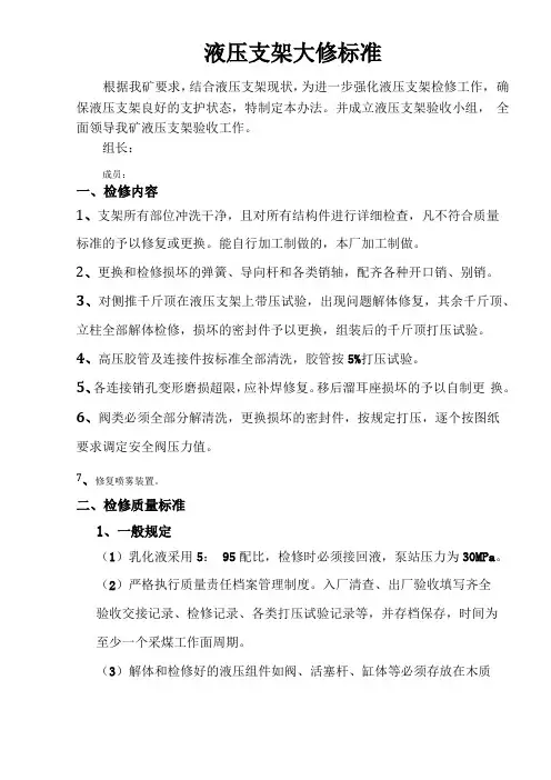 液压支架大修标准根据我矿要求,结合液压支架现状,为进一步强化液压支架检修工作,确保液压支架良好的支护状态,特制定本办法。