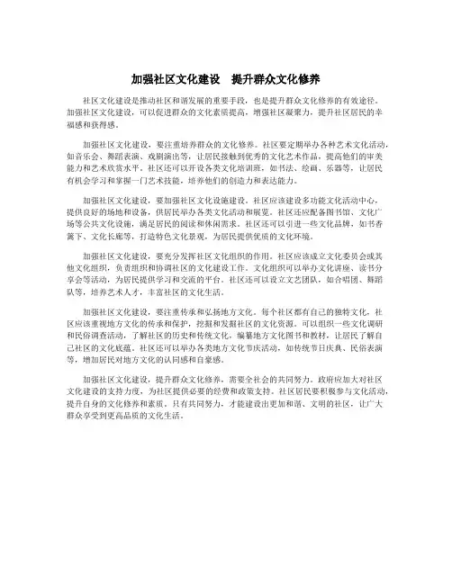 加强社区文化建设提升群众文化修养1. 引言1.1 社区文化建设的重要性社区文化建设的重要性在于其作为社会文化的基础单位,承载着人们日常生活和精神生活的方方面面。