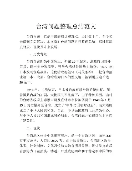 台湾问题[5篇模版]第一篇:台湾问题台湾问题之我见习总书记说过:实现中华民族的伟大复兴就是最伟大的中国梦。