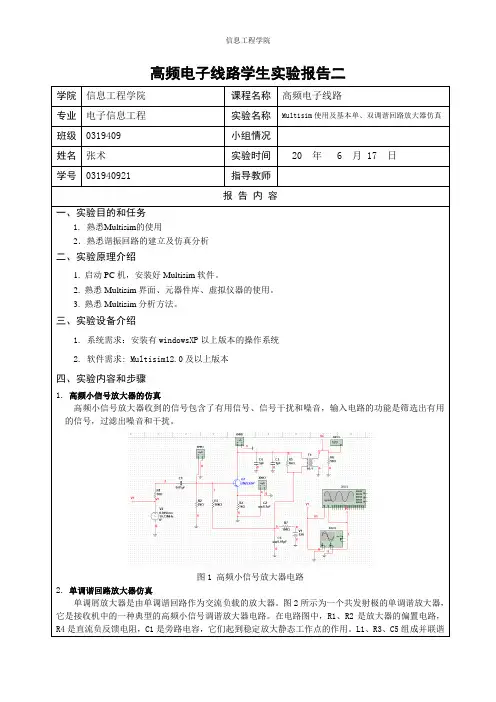 ⾼频电路实验及Multisim仿真实验⼀⾼频⼩信号放⼤器⼀、单调谐⾼频⼩信号放⼤器图1.1 ⾼频⼩信号放⼤器1、根据电路中选频⽹络参数值,计算该电路的谐振频率ωp ;s rad CLw p /936.2105801020011612===--2、通过仿真,观察⽰波器中的输⼊输出波形,计算电压增益A v0。