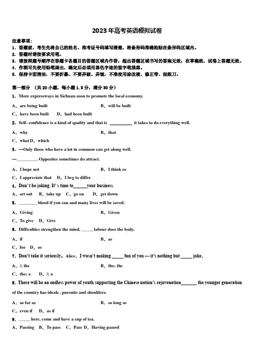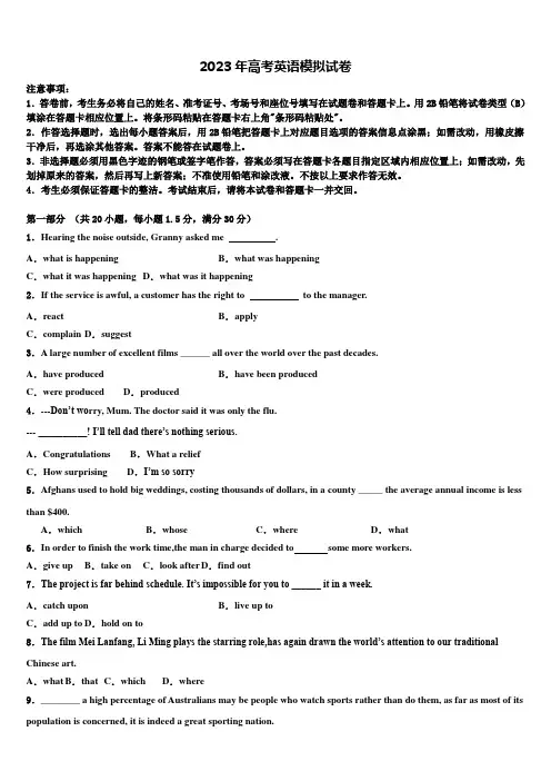 2023年高考英语模拟试卷注意事项:1.答题前,考生先将自己的姓名、准考证号码填写清楚,将条形码准确粘贴在条形码区域内。