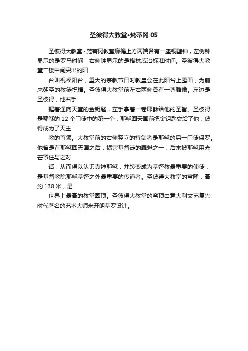 二、主要参观景点1. 圣彼得大教堂圣彼得大教堂是梵蒂冈的标志性建筑之一,也是世界上最大的天主教堂。