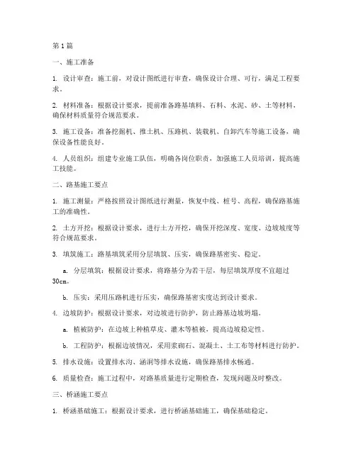 第2篇一、施工准备1. 施工测量:在施工前,应对路基中线、高程进行测量,确定路基的平面位置和高程控制点。