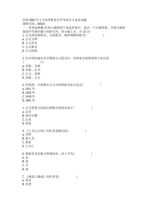 全国2003年4月高等教育自学考试公文选读试题课程代码:00525一、单项选择题(在每小题的四个备选答案中,选出一个正确答案,并将正确答案的序号填在题干的括号内。
