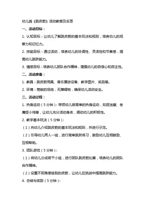 五、教学反思:1. 本次教学中,幼儿对跳皮筋的基本动作掌握情况如何?是否需要加强个别指导?2. 幼儿在游戏环节中的团队合作精神和互相帮助的情况如何?是否需要进一步引导?3. 创意展示环节中,幼儿的表现如何?是否能够积极参与并展示自己?4. 整体教学过程中,幼儿的兴趣和参与度如何?是否需要调整教学方法和内容?六、教学评价:1. 观察幼儿在课堂上的参与程度,了解他们对跳皮筋活动的兴趣。