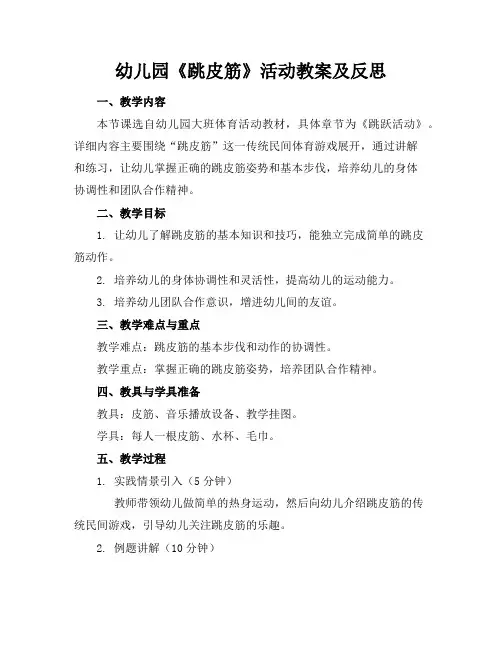 八、课后反思及拓展延伸1. 课后反思:本次教学活动中,幼儿对跳皮筋表现出浓厚的兴趣,基本掌握了跳皮筋的动作和节奏。